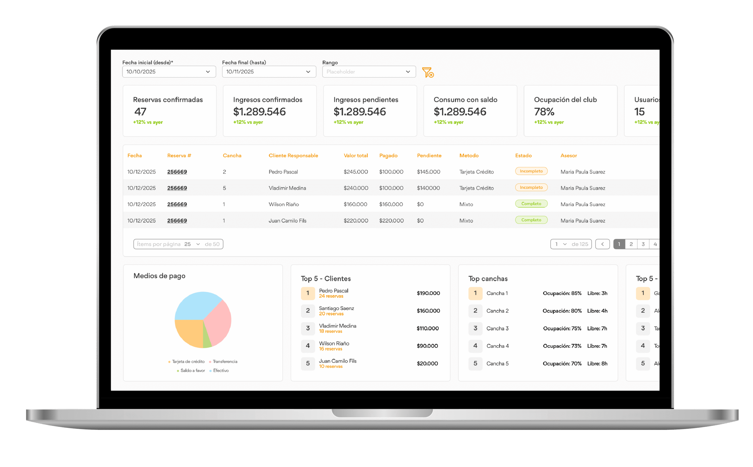 Toma decisiones con datos reales. Visualiza ventas del día, reservas activas, ocupación por cancha y comportamiento de tus jugadores en un solo panel.