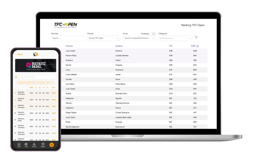 Carga resultados de partidos o torneos y actualiza automáticamente la posición y nivel de cada jugador. Un sistema transparente que construye competitividad real.